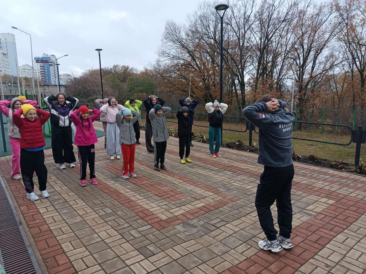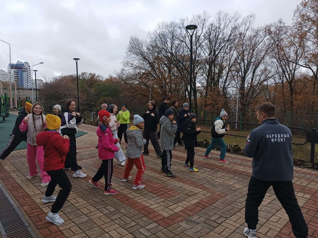 Зарядку провели активисты Молодежки Народного Фронта совместно с Сергеем Алексеевичем Тарасовым, кандидатом в мастера спорта по боксу, призером первенства России по боксу и победителем Центрального Совета спортивного общества "Динамо".